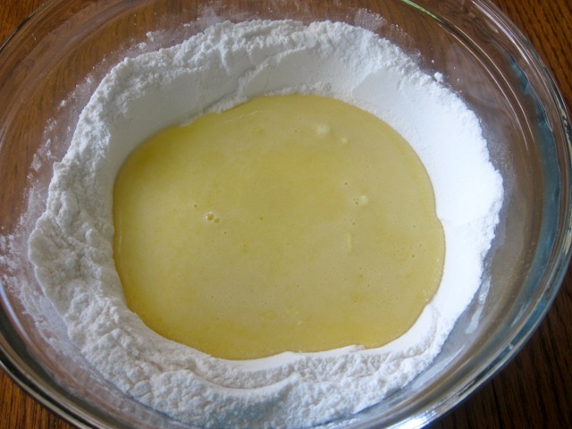 In another bowl, whisk together the two eggs, buttermilk, melted butter and vanilla essence (extract).