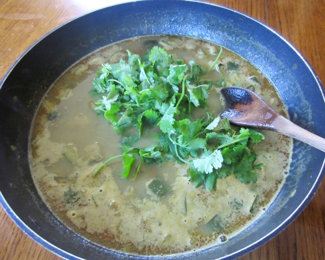 - Add the zucchini and bring back to the boil and hen simmer another 10 minutes or until the zucchini is tender. Just before switching off the heat, add the coriander leaves.