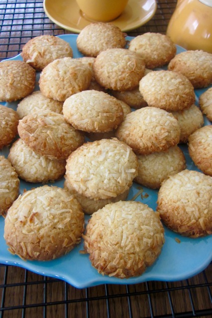 4. Roll rounded tablespoons of the dough into balls and then roll the balls in the extra coconut. Place the balls 4 cm (1½-inch) apart on prepared cookie sheets and flatten slightly. Bake 10-15 minutes or until light golden.