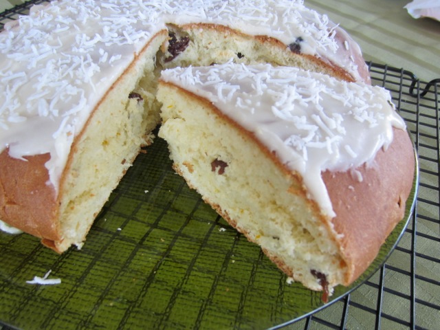 Pour the icing over tea bun and sprinkle with desiccated (or shredded) coconut.
