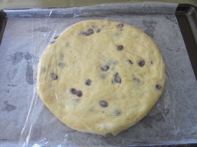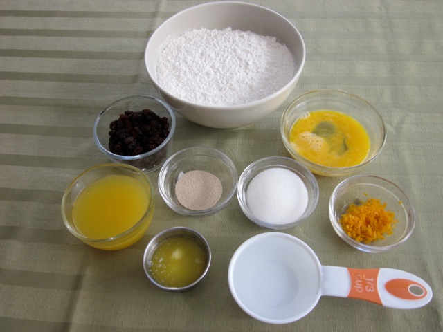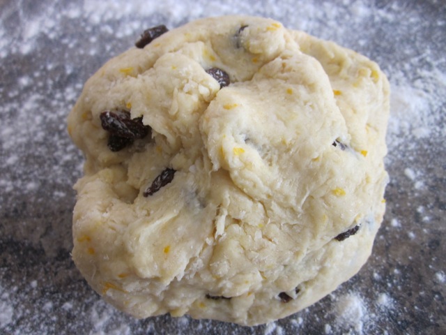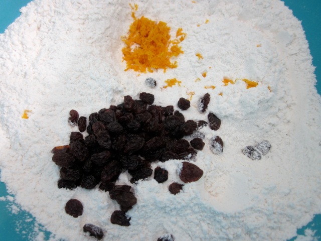 1. Preheat the oven to 375°F (190°C). Line a baking sheet with parchment (greaseproof) paper. Sift the flour, instant yeast, and castor sugar. Add the orange rind and raisins, stir to combine then make a well in the centre.