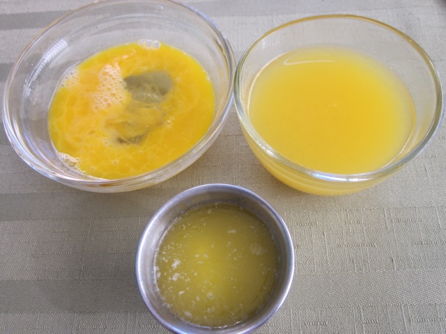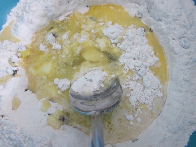 2. Add the orange juice, beaten egg and melted butter into the well and almost all the water.