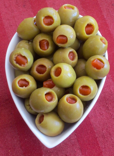Olea europaea L. Stuffed olives are cured and pitted green olives, stuffed with pimento (cherry…